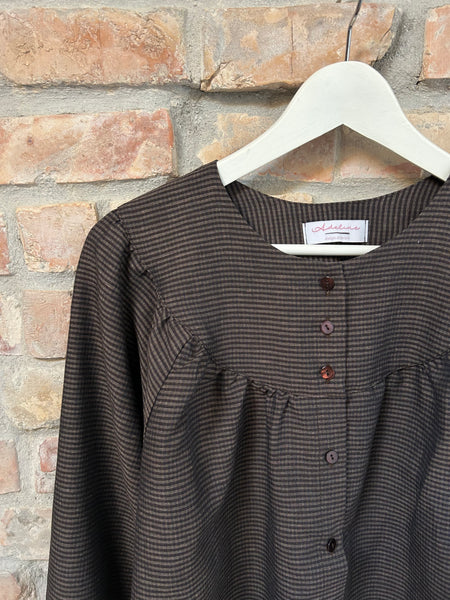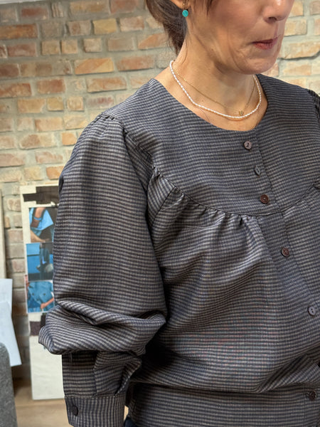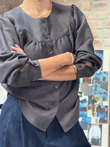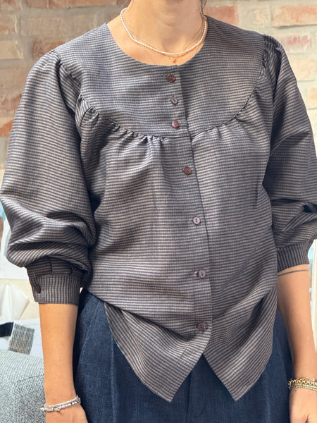 Camicia dal gusto bohèmienne con scollo a giro, taglio pettorina davanti da cui parte un'arricciatura che crea movimento. Vestibilità morbida a scatola e manica lunga e leggermente a palloncino con polsino chiuso da asola e bottone.