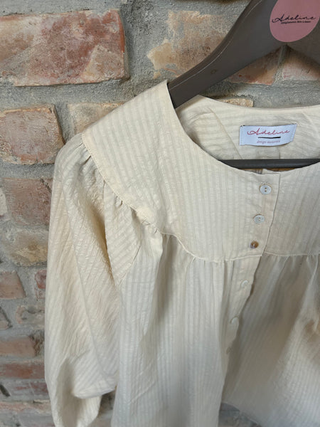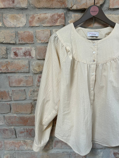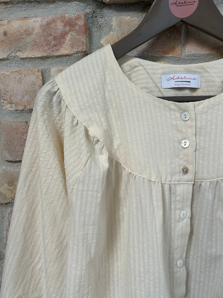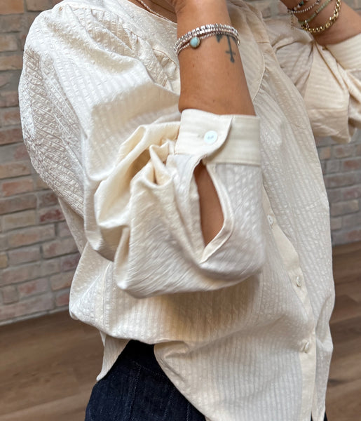 Camicia dal gusto bohèmienne con scollo a giro, taglio pettorina davanti da cui parte un'arricciatura che crea movimento. Vestibilità morbida a scatola e manica lunga e leggermente a palloncino con polsino chiuso da asola e bottone.