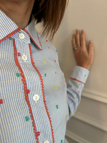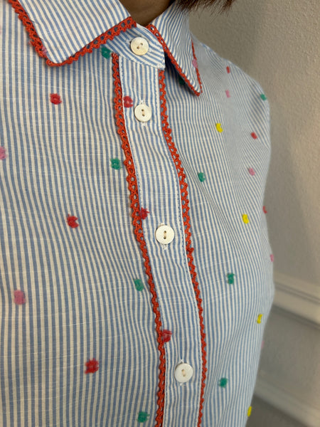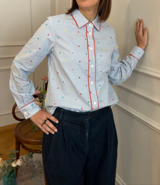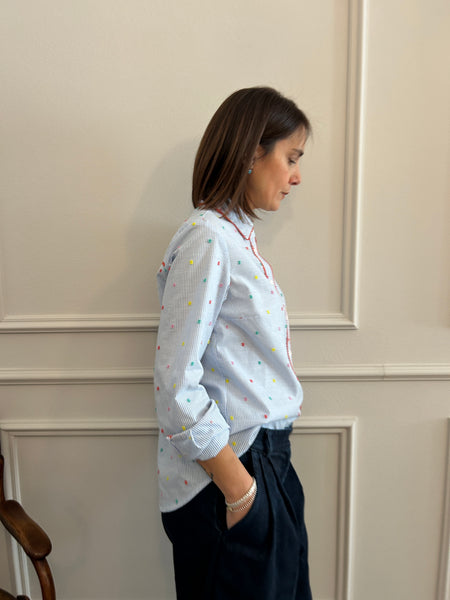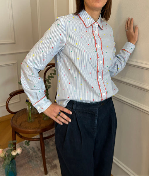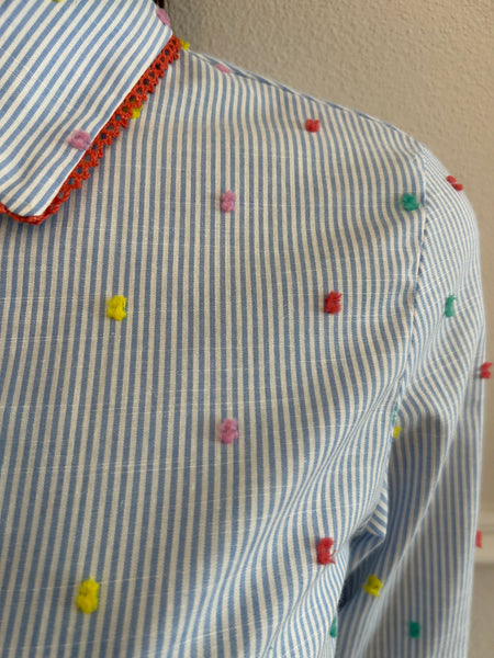 Una camicia dal taglio classico e vestibilità regolare non può mancare nel tuo armadio. Soprattutto che se è tempestata di coloratissimi pois e impreziosita da piccoli dettagli in pizzo. Il contrasto tra il taglio maschile e la femminilità dei particolari la rendono perfetta per ogni occasioni. dall'ufficio al tempo libero, da giorno a sera. Collo classico a camicia, manica lunga con polsino con asola e bottone, spallone e piega su schiena dietro, fondo classico stondato, il tutto impreziosito da un bordo in pizzo macramè inserito al cannoncino, ai polsi e al collo.