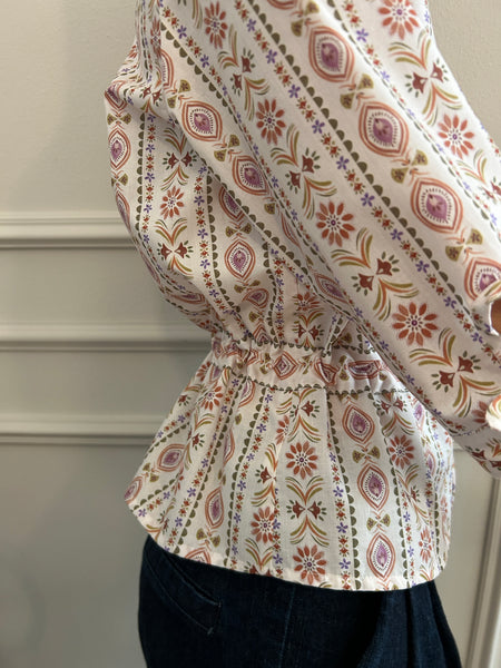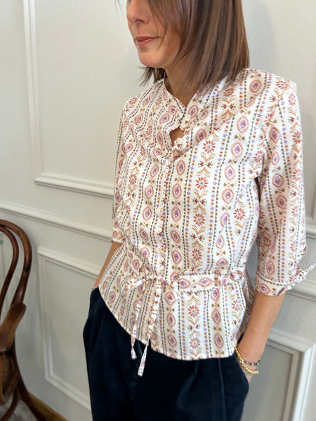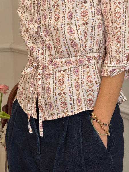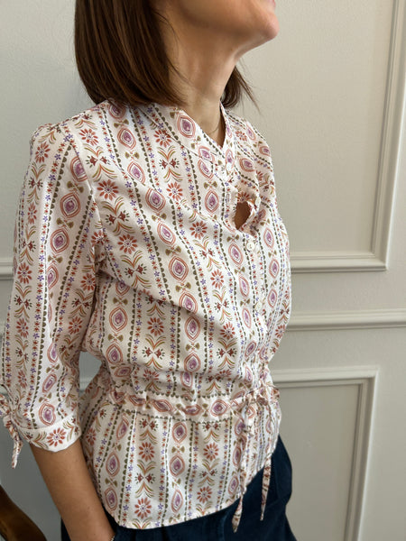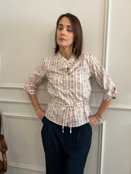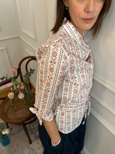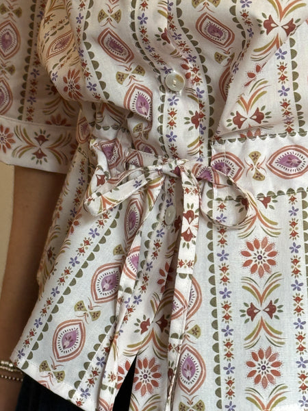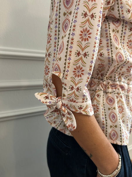In perfetto equilibrio tra lo stile Folk e quello Bohemien, evoca subito quell'atmosfera romantica che non gusta mai. Ha una vestibilità a scatola e spalla regolare. In vita c'è una coulisse che ti permetterà di regolarla e avvitarla al corpo in base a come più ti piace. La manica è a 3/4 con un piccolo nodino a fiocco per chiudere il polso. Il collo è alla coreana e la lunghezza è al fianco.
