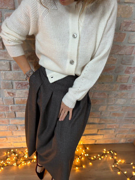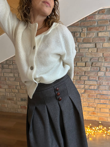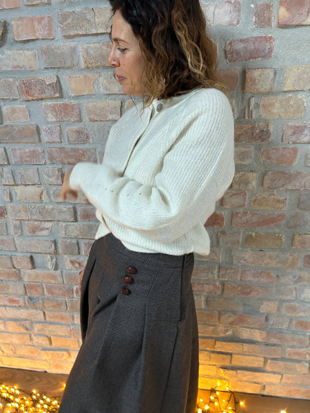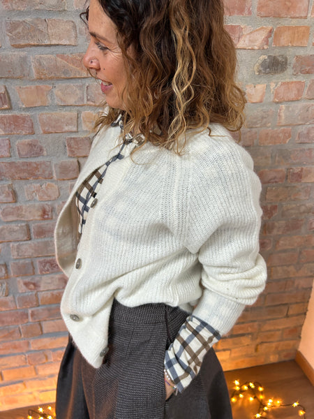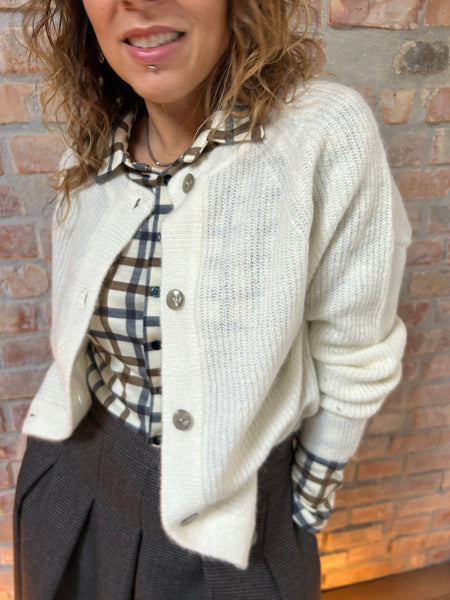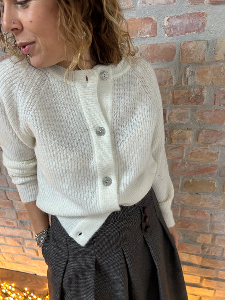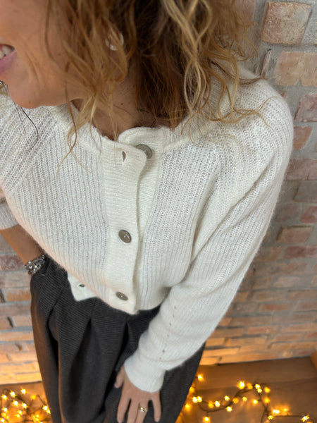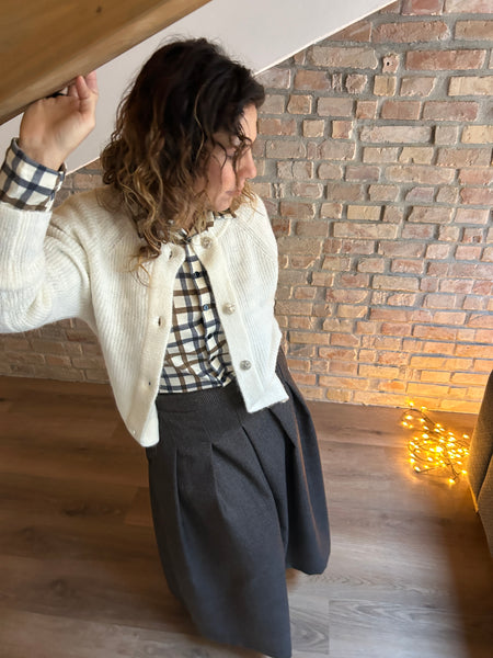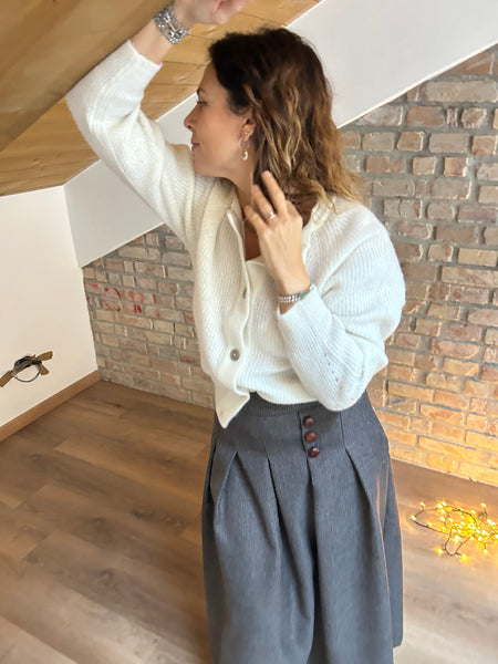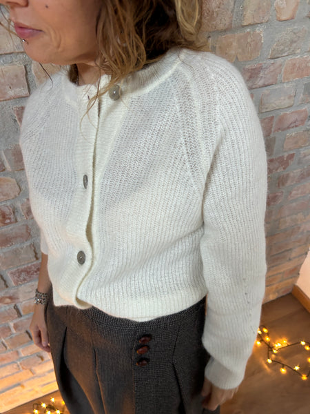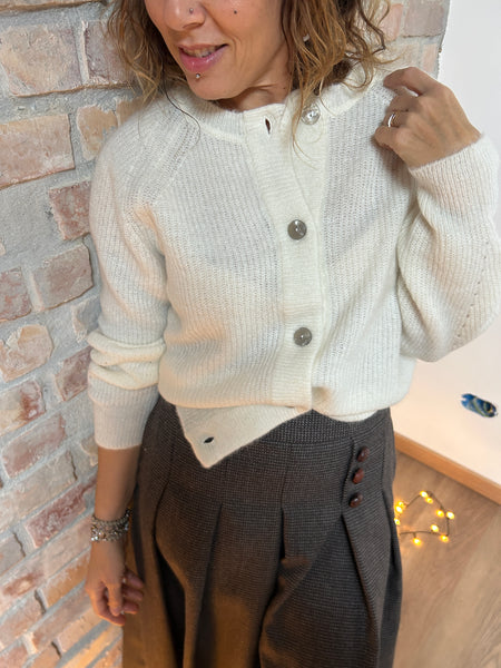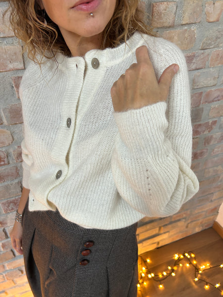 Dalla mischia di due filati naturali e pregiati come la Lana e l'Alpaca, nasce un cardigan dal taglio a scatola. La Manica raglan con le calature a vista e il piccolo gioco di trafori alla manica raccontano di una lavorazione artigianale e del lavoro manuale che c'è dietro ad un capo di maglieria ben fatto. Scollo a giro e abbottonatura al davanti