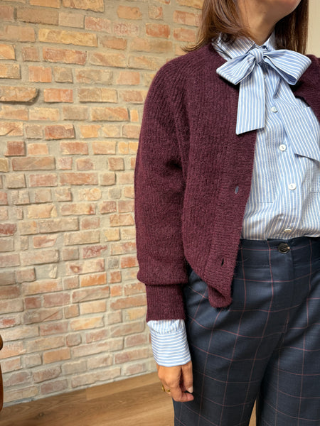 Dalla mischia di due filati naturali e pregiati come la Lana e l'Alpaca, nasce un cardigan dal taglio a scatola. La Manica raglan con le calature a vista e il piccolo gioco di trafori alla manica raccontano di una lavorazione artigianale e del lavoro manuale che c'è dietro ad un capo di maglieria ben fatto. Scollo a giro e abbottonatura al davanti