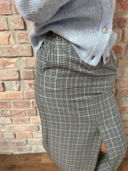 Vestibulità slim, apertura con zip davanti e tasche a uomo laterali. Profondo spacco fino al ginocchio centro davanti. Sulla cinta dietro c'è porzione di elastico per il massimo confort.