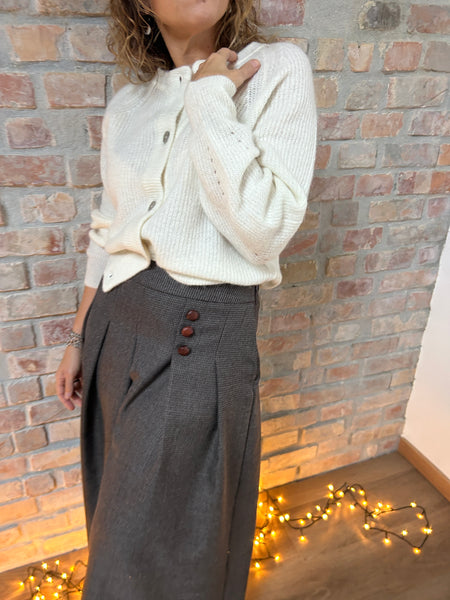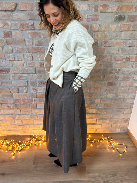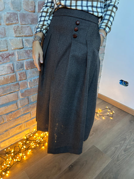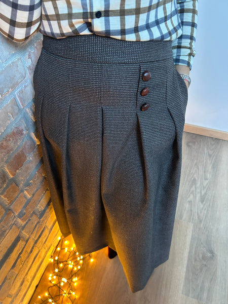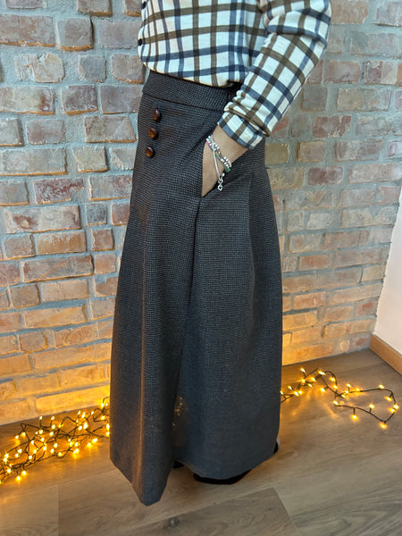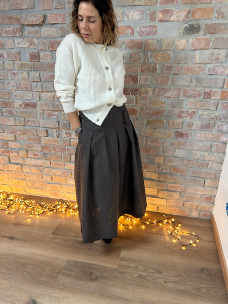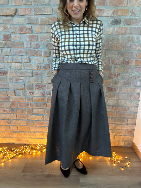 Pensata con una lunghezza alla caviglia (che però puoi personalizzare). E' una gonna con pieghe sia davanti che dietro che regalano ampiezza e morbidezza al fondo, ma per evitare l'effetto "palloncino" sono chiuse e piatte per il primo tratto in modo che seguano il corpo per evidenziare la siluette. Il dettaglio del bottone ricoperto in pelle sul davanti crea motivo e la rende unica.