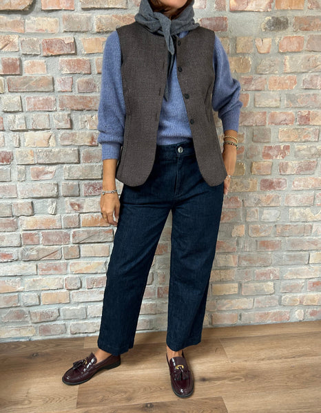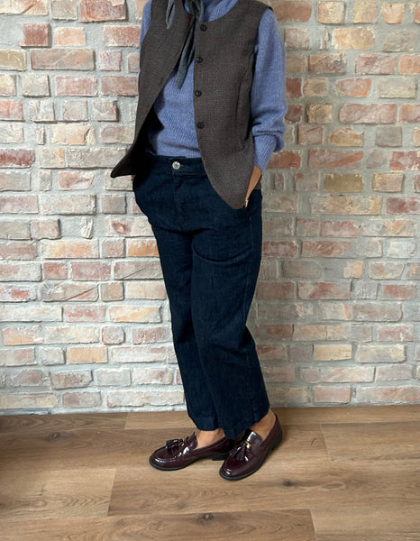 Il jeans che mancava!! Non il solito 5 tasche, ma più elegantino e formale con tasca a uomo. La gamba è dritta come d'ispirazione anni '90. Vita media, vestibilità regolare e lunghezza leggermente crop. Tasche a uomo sul fianco. Apertura davanti con zip. Porzione di elastico sul dietro della cinta per il massimo confort.. Lunghezza è circa 90 cm nella taglia XS (come in foto) Il tessuto è leggermente stretch.