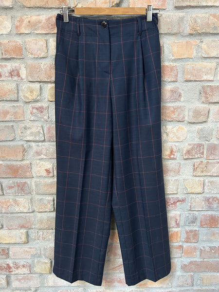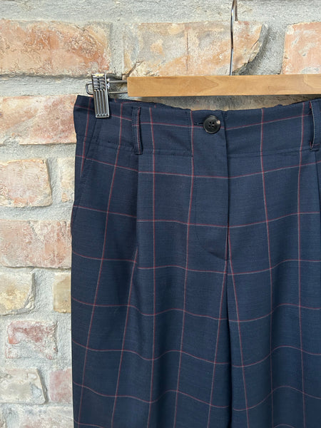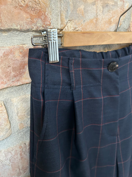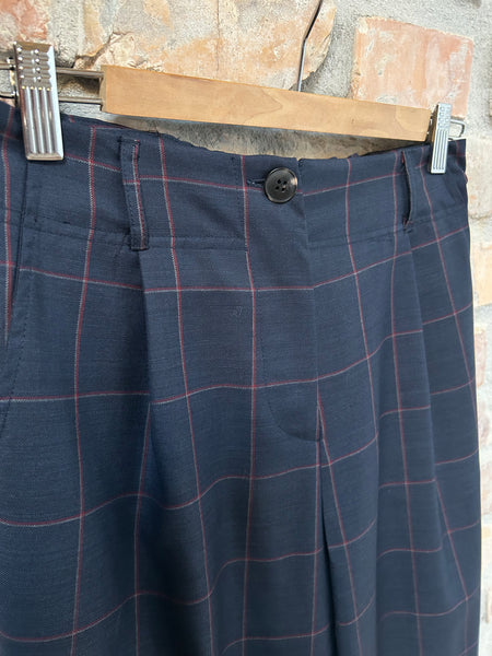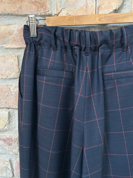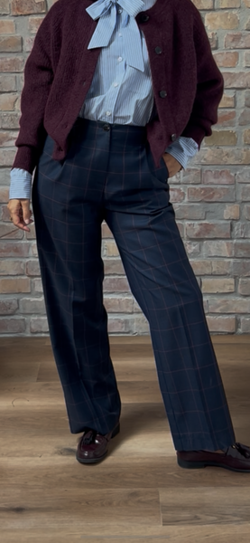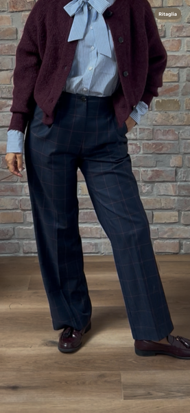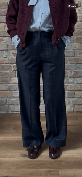 Vita alta con classica piega al davanti, tasche a uomo sul fianco e a filetto sul dietro. Sulla cinta dietro c'è una porzione di elastico per rendere più confortevole e flessibile la vestibilità. Gamba ampia e dritta.
