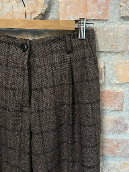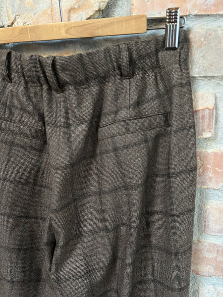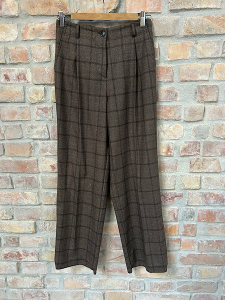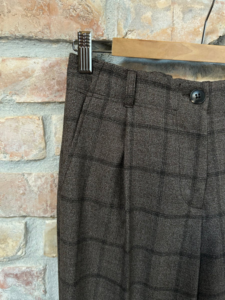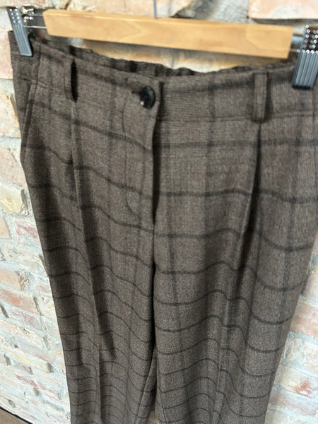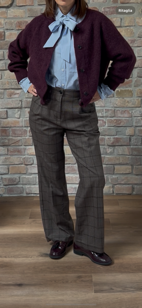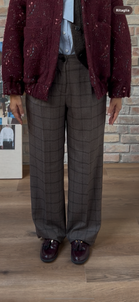 Vita alta con classica piega al davanti, tasche a uomo sul fianco e a filetto sul dietro. Sulla cinta dietro c'è una porzione di elastico per rendere più confortevole e flessibile la vestibilità. Gamba ampia e dritta.